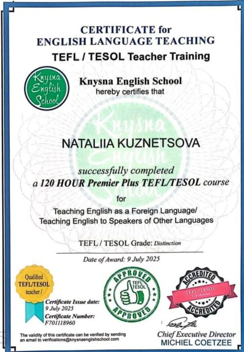 Ми раді привітати нашу колегу, Наталію Володимирівну Кузнєцову, з успішним завершенням міжнародного курсу TEFL/TESOL (120 годин) та здобуттям сертифіката з відзнакою!