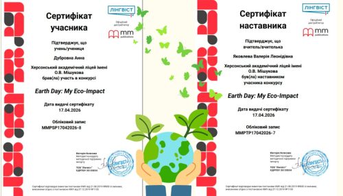 🌍✨ Вітаємо Дубровну Анну, ученицю 11 ІНФ класу, яка під наставництвом Валерії Яковлевої взяла участь у конкурсі “Earth Day: My Eco-Impact”, продемонструвавши активну громадянську позицію та небайдужість до екологічних проблем сучасності.