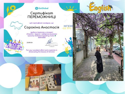 У рамках першої хвилі міжнародного проєкту “GoGlobal Speaking Club 2024-2025” учні та учениці 10 УІФ та 11 ЖМВ класів взяли участь у конкурсі відео-презентацій “Україна – відома і невідома”. Учениця 10 УІФ Сорокіна Анастасія здобула перемогу в цьому конкурсі та отримала чудові подарунки від організаторів проєкту GoGlobal , American House та Міжнародної мовної школи Helen Doron. Вітаємо Анастасію та її вчительку Ліпінець Марину Валеріївну з заслуженою перемогою та бажаємо не зупинятись на досягнутому!