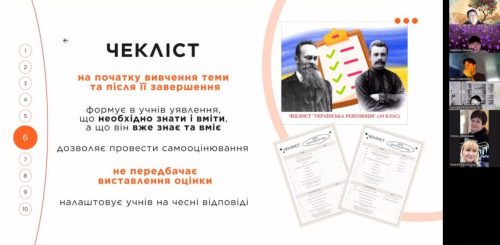 Герінбург Ольга поділилася з колегами своїм досвідом використання таких дієвих інструментів формувального оцінювання, як інтерактивні аркуші та чеклісти, які дозволяють учням/-еницям зорієнтуватися в навчальному матеріалі та провести самооцінювання власних знань та вмінь.