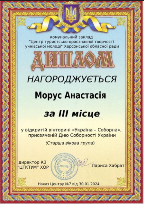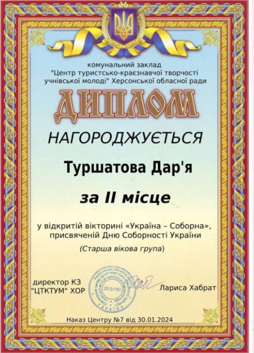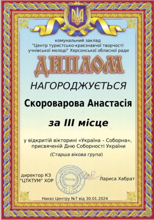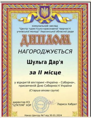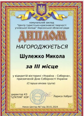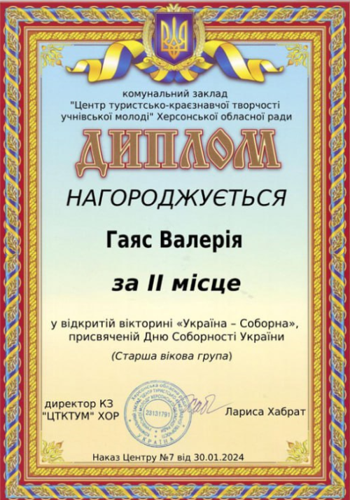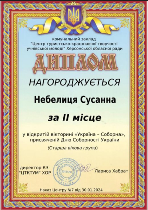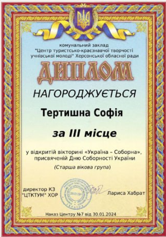 Вітаємо ліцеїстів і ліцеїсток 10-11 класів, які посіли призові місця у вікторині Херсонської обласної ради “Україна – Соборна!”, присвяченій Дню Соборності України.