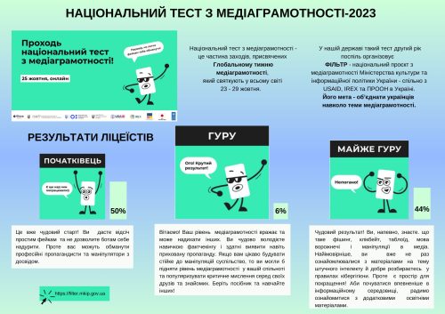 25 жовтня учні й учениці 10-их класів Херсонського академічного ліцею імені О.В.Мішукова за ініціативою вчительки громадянської освіти та історії О.Герінбург мали змогу визначити свій рівень медіаграмотності. Спеціальний тест був розроблений Міністерством культури й інформаційної політики до Глобального тижня медіаграмотності.