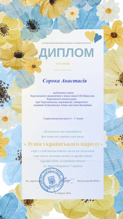 У грудні учениця 9 ІНФ класу Анастасія Сорока взяла участь в обласному дистанційному фестивалі української пісні “Душа українського народу”, організованому Херсонським державним будинком художньої творчості. Майстерне та душевне виконання пісні “Йшла до Бога Україна” (сл. Соломії Українець, муз. Олени Шушвар) принесло Анастасії перемогу!