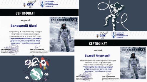 Талановита Діана Волошина, учениця 10 УІФ класу, за підтримки вчительки англійської мови Валерії Яковлевої, взяла участь у ІІІ Міжнародному конкурсі творчого письма за фільмом для старшокласників та студентів І курсу “Переглядай рефлексивно, досліджуй доброчесно, мисли критично, пиши креативно! (англійською мовою)” від Сумського педагогічного університету факультету іноземної та слов’янської філології.