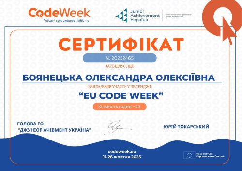 Наша ліцейська родина щиро пишається Боянецькою Олександрою, ученицею 10-ЖМВ класу, яка стала учасницею EU Code Week 2025! 💻✨